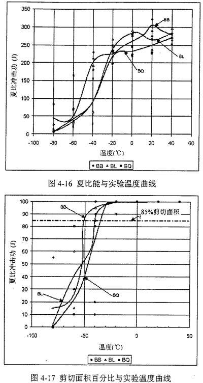 表4-3給出了歸納的夏比沖擊能量值及85%剪切面積對應(yīng)的轉(zhuǎn)變溫度。