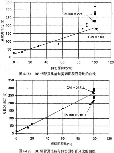 圖4-18a,b,c給出了三家鋼管的夏比能與剪切面積的關(guān)系,以及85%剪切面積對應(yīng)的轉(zhuǎn)變溫度。圖中CV100表示100%剪切面積時最低的夏比能,CVI表示最低夏比平臺能,也稱夏比轉(zhuǎn)變能,CVP表示夏比平臺能。菱形實驗點表示剪切面積高于90%,方形實驗點表示低于90%可以看到,剪切面積低于90%時,夏比能與剪切面積呈線性關(guān)系。