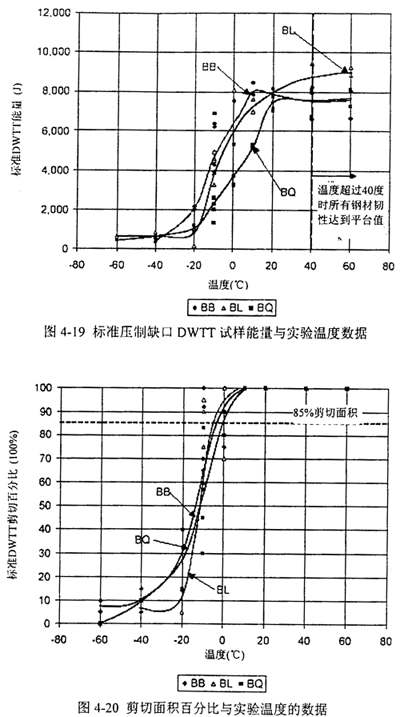 圖4-19顯示了標(biāo)準(zhǔn)壓制缺口DWTT試樣能量與實驗溫度數(shù)據(jù)。