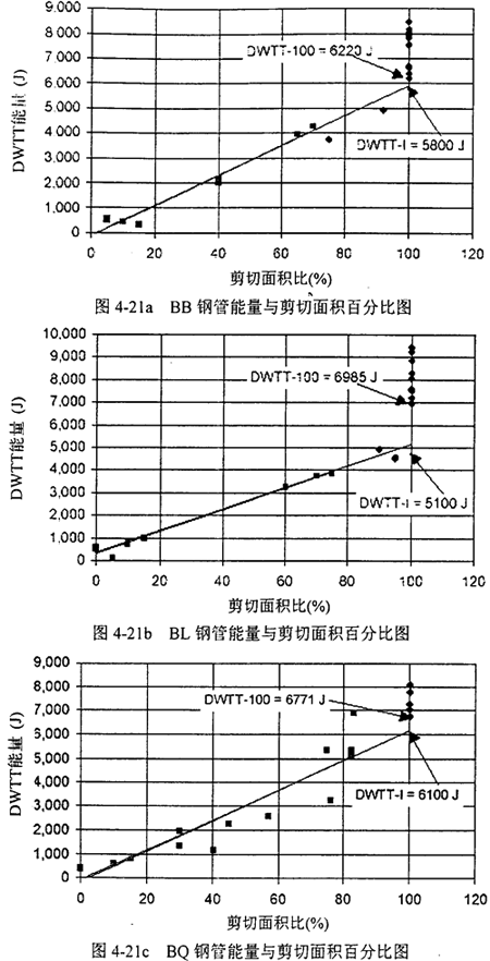 圖4-21a,b,c是能量與剪切面積百分比圖。和前面-樣,菱形實驗點表示剪切面積高于90%,方形表示低于90%。與對CVN數(shù)據(jù)的處理類似,分別定義DWTT-100表示100%剪切面積時最低的DWTT能,DWTT-I表示DWTT轉(zhuǎn)變能,DWTT-P表示DWTT平臺能。由圖4-21可確定DWTT和DWTT-100的值。