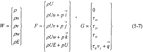 式中P為密度,U=u+v+w表示速度,E為總能,,分別為沿x,y,z方向的單位矢量。為粘性應力項,是熱通量。