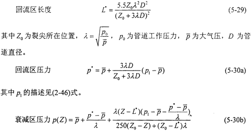 其三是衰減區(qū)的壓力變化。氣流通過裂紋尖端時,管壁上作用的氣體壓力沿軸向迅速衰減,經(jīng)驗公式(2-47)中所用的衰減長度一般取為1.5倍管道直徑,最終衰減到零。計算表明衰減長度隨管道工作壓力的升高而增加,并且衰減區(qū)壓力的最低值與管道的工作壓力相關(guān)。由于對裂紋的擴展?fàn)顟B(tài)影響甚微,裂尖前部的壓力不是關(guān)心的對象。