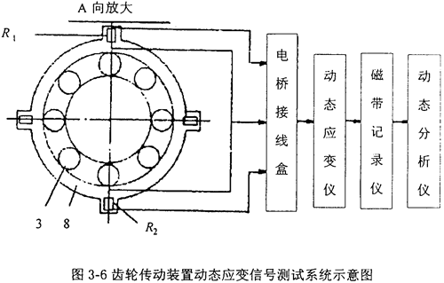 圖3-5是被測試的齒輪傳動裝置傳動系統(tǒng)簡圖,圖3-6是測試該齒輪傳動裝置箱體動態(tài)激勵力應(yīng)變信號的系統(tǒng)示意圖。零件8為裝在軸承外圈上的套圈。套圈把軸系施加給軸承的載荷分成水平方向和垂直方向再傳給箱體。如圖3-6所示,在套圈的水平和垂直方向分別貼上兩片電阻應(yīng)變片,并分別組成各自的全電橋電路。當(dāng)軸系產(chǎn)生振動時,軸承對箱體的作用力也隨之發(fā)生變化,也使貼在套圈上的應(yīng)變片的電阻值產(chǎn)生變化,而電阻的變化則通過動態(tài)電阻應(yīng)變儀輸出電壓信號,并經(jīng)磁帶記錄儀將此電壓信號記錄下來。若將所得的信號在動態(tài)數(shù)字分析儀上進行時域和頻域分析,再經(jīng)過比較,就可對齒輪傳動裝置內(nèi)的軸系部件的故障作出較為正確的診斷。