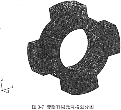 套圈是一個(gè)不規(guī)則的零件,先用有限元按三維八節(jié)點(diǎn)實(shí)體單元對(duì)它進(jìn)行網(wǎng)格劃分,圖3-7是有限元網(wǎng)格劃分圖。邊界條件是這樣處理的:由于套圈裝在減速機(jī)箱體孔中時(shí),和孔的配合是過盈配合,且套圈內(nèi)表面與傳動(dòng)軸外表面也是過盈配合,故套圈的配合面處均按固支對(duì)待。經(jīng)ABAQUS有限元軟件處理后輸出質(zhì)量矩陣和剛度矩陣,然后用廣義的Collatz包含定理求出它的低階固有頻率。