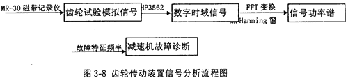圖3-8是齒輪傳動(dòng)裝置信號(hào)分析流程圖,用HP3562動(dòng)態(tài)數(shù)字分析儀采集MR-30磁帶記錄儀紀(jì)錄的二級(jí)圓柱斜齒輪減速機(jī)試驗(yàn)過程中的模擬信號(hào),可得到齒輪傳動(dòng)裝置載荷、齒輪傳動(dòng)裝置箱體動(dòng)態(tài)激勵(lì)力應(yīng)變變化的時(shí)域信號(hào),對(duì)此信號(hào)作FFT變換,可得到載荷譜和動(dòng)態(tài)激勵(lì)力應(yīng)變變化時(shí)域信號(hào)的功率譜。為了防止功率譜泄露,在作FFT變換時(shí),需作加窗處理,由于試驗(yàn)采集的是隨機(jī)信號(hào),故加漢寧(Hanning)窗處理。利用故障診斷特征參數(shù)-傳動(dòng)零件可能發(fā)生故障的振動(dòng)頻率及其振動(dòng)頻率處的功率對(duì)試驗(yàn)信號(hào)進(jìn)行診斷分析。當(dāng)功率譜所包含的頻率成份難以區(qū)分時(shí),可采用倒譜分析。